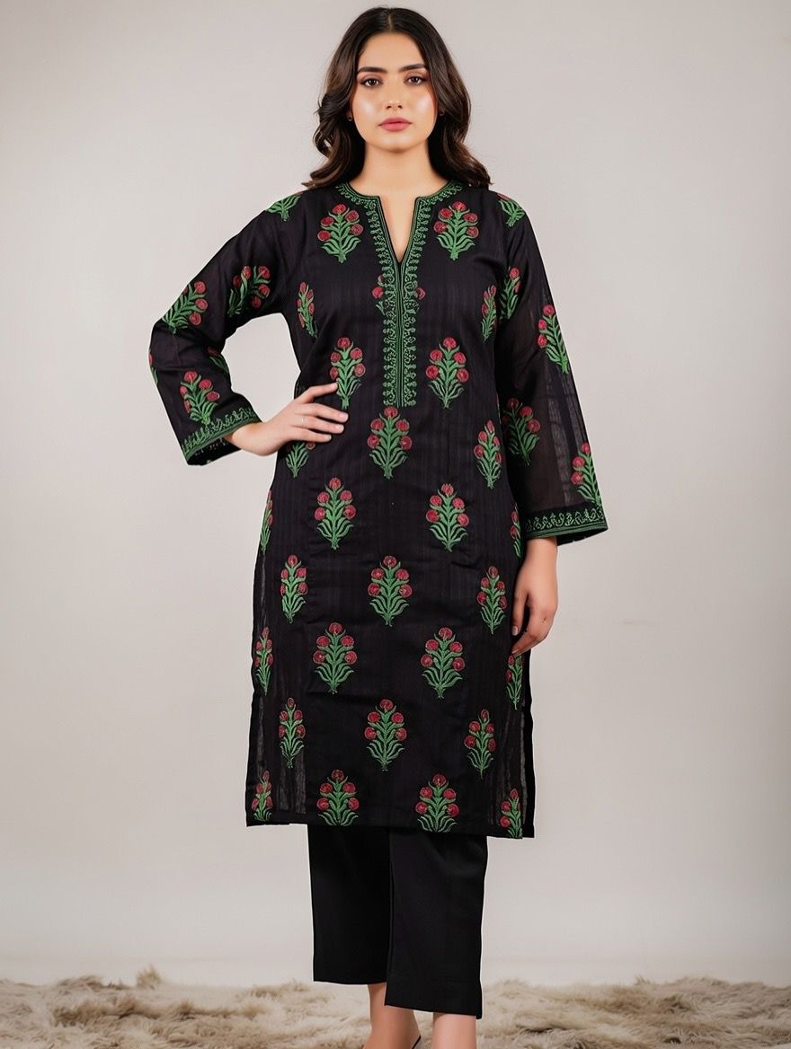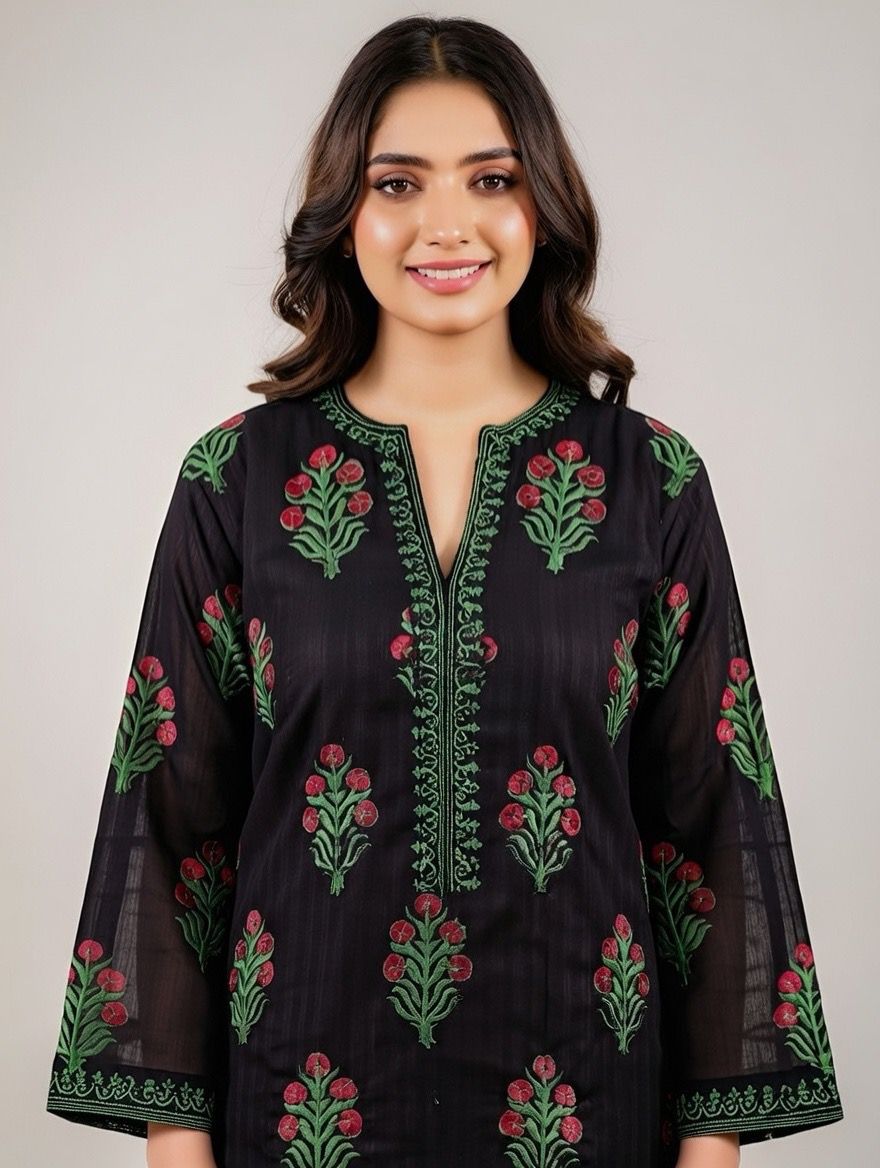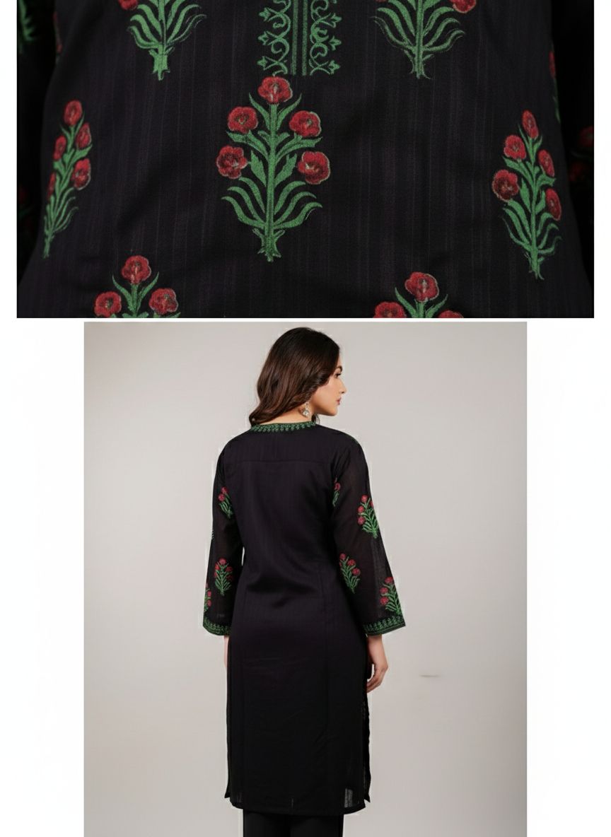 A black block printed shirt featuring elegant red floral motifs with green leaves. Crafted from soft and breathable fabric, this shirt offers comfort and effortless style. Perfect for everyday wear and casual occasions.